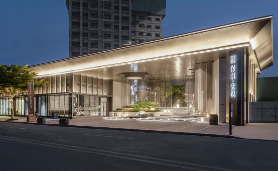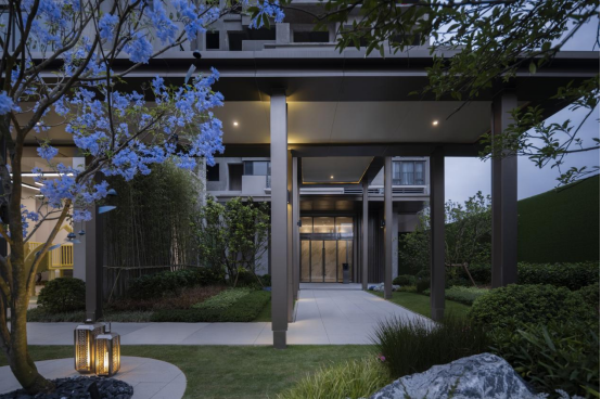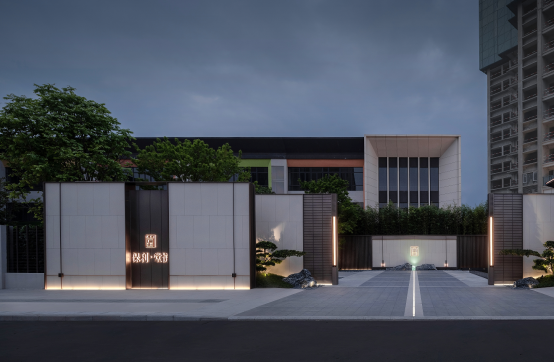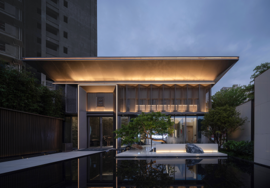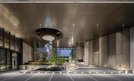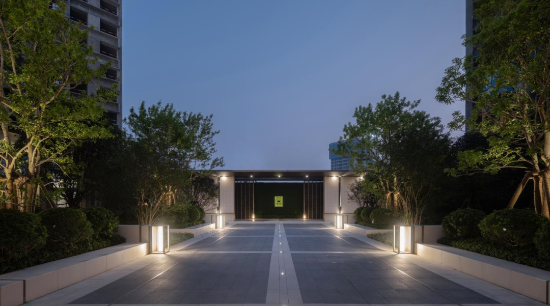 经过礼章厅廊,空间由收至放。在灯光的衬托下,整个空间传达的是集风雅于园内的景象。草坪开阔,端景写意,视线聚焦于景墙及孤植的丛生凤凰木。端景景墙设置巧妙漏景,为中式园林常用的造景手法之一。景墙匠心独到,“方圆”有天地的含义,设计方圆造型传达咫尺之间容纳天地的意蕴。