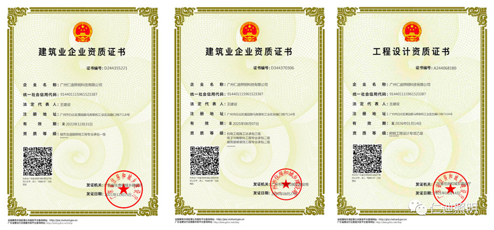 获得城市及道路照明工程专业承包一级,机电工程施工总承包三级、电子与智能化工程专业承包二级、建筑装修装饰工程专业承包二级、照明工程设计专项乙级等资质。